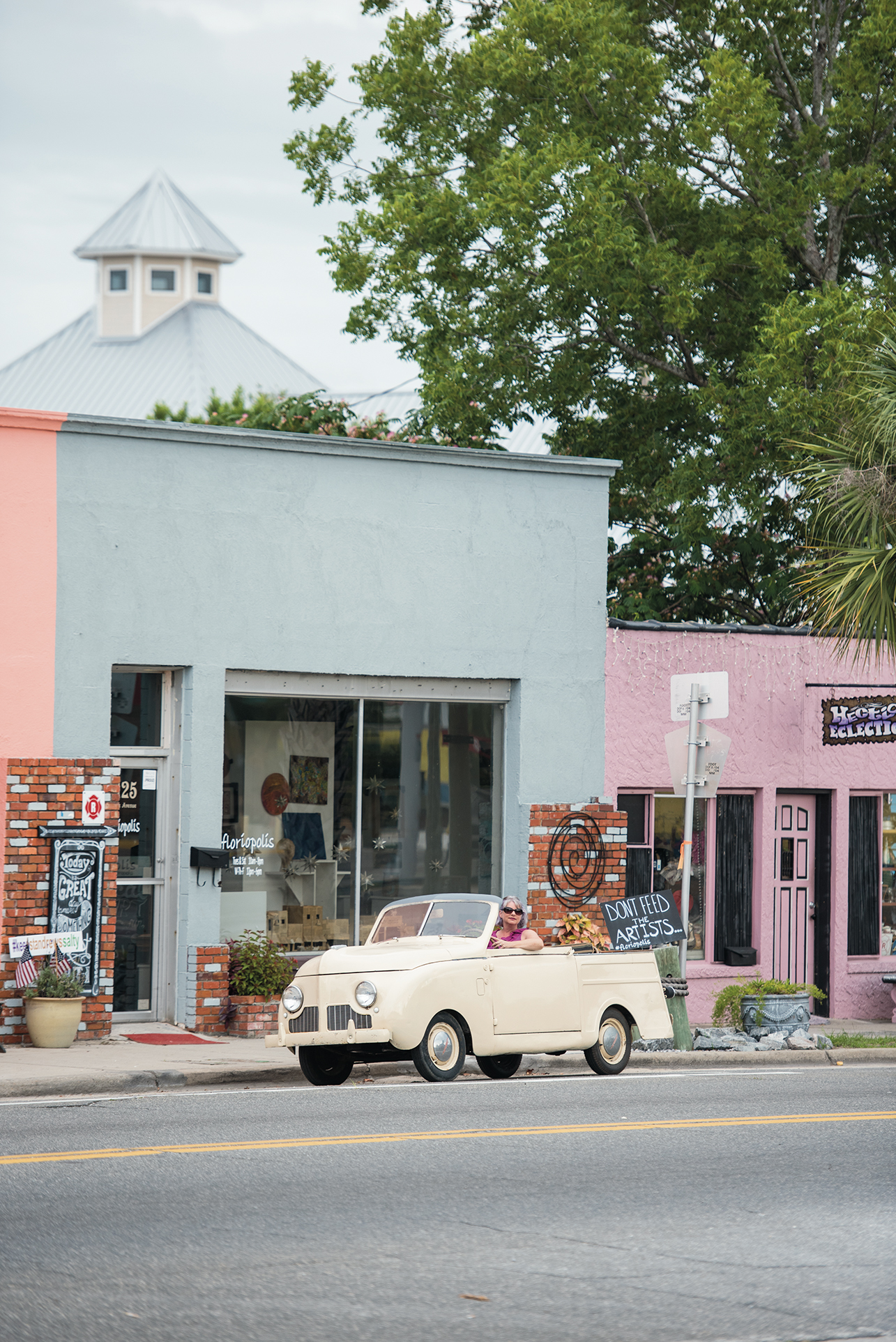 Walk or drive down Beck Avenue in Historic St. Andrews on a sunny day and most likely you will see a small quirky car parked in front of Floriopolis, a nonprofit “community arts & culture metropolis.” The vintage car is a 1948 Crosley owned by Heather Parker, resident artist and founder of Floriopolis. With a clear mission, Heather started looking for a vintage car last year. “I wanted a car that would be easy to get around in and would draw attention to St. Andrews, Floriopolis, and art. I wanted an unusual artistic car, in keeping with the ‘Keep St. Andrews Salty’ spirit.”
