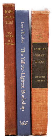 My latest travels did not disappoint. I discovered three jewels in a tiny bookstore set back from the street in a small town about an hour from Halifax, Nova Scotia. I walked by it three times before even noticing the entrance door. Located in an old red-brick building with a somewhat gothic appearance, a sweet elderly Labrador retriever kept me company as I wandered the bookstacks. His owner (and the owner of the bookstore) told me the Lab was in charge. With the Lab by my side, I found three beautifully bound and well cared for hard cover editions with rather obscure titles; The Diary of Samuel Pepys edited by Richard Le Gallienne, Modern Library (1921), 1066 And All That by W.C. Sellar and R. J. Yeatman (1930), and The Yellow-Lighted Bookshop by Lewis Buzbee (2006). The two older titles, publishedmore than 85 years ago, sparked my curiosity.