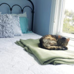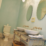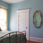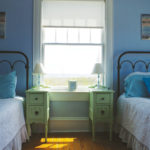 The bright red front door opens to the foyer and reveals wide stairs that lead to the second story. French doors open to the front parlor, dining room, kitchen, and adjacent living room. Subtle colors in each living space set the mood. The walls downstairs are painted in shades of green, inspired by the trees and nature. Upstairs, the blue tones remind of the sky and the beautiful water views. Anna, an encaustic artist, has put her mark on the house. “As a painter, I worked on the colors. It took me about two weeks to finally pick them out. The light here is beautiful and, on different times of the day, the light plays with the colors. The colors have to work together. They have their own personality in each room.”