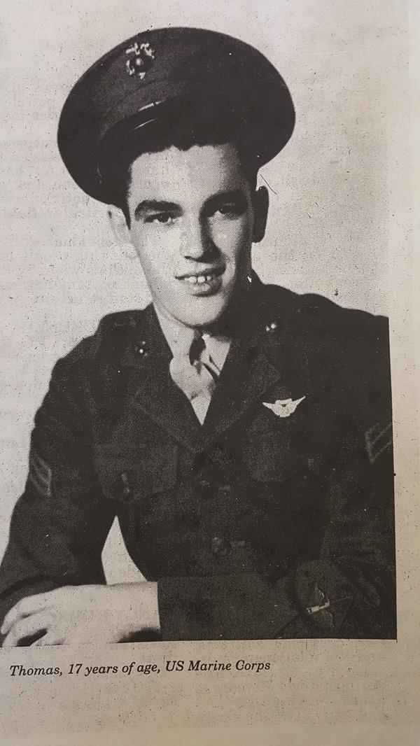 Thomas grew up in Woodhull, NY, a town with a population of 500. In 1942 he enlisted in the United States Marine Corps. He was 17 years old and would fight in the South Pacific as a turret gunner on a PBJ bomber. While stationed in North Carolina, he met his future wife, Virginia Scott. She was from Birmingham, Alabama and had joined the first group of Women Marines from the State of Alabama and became a USMC supply officer. Both served during World War II.