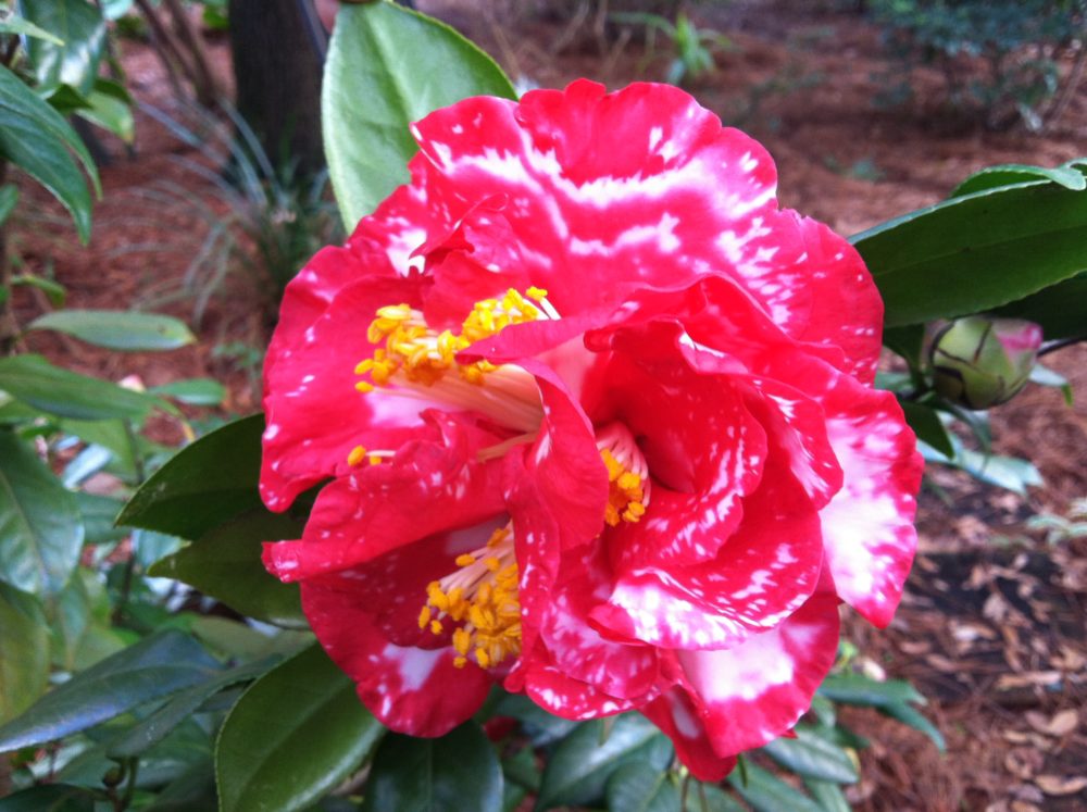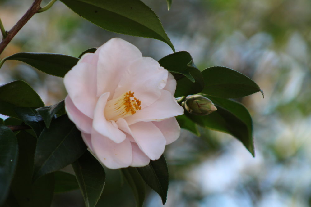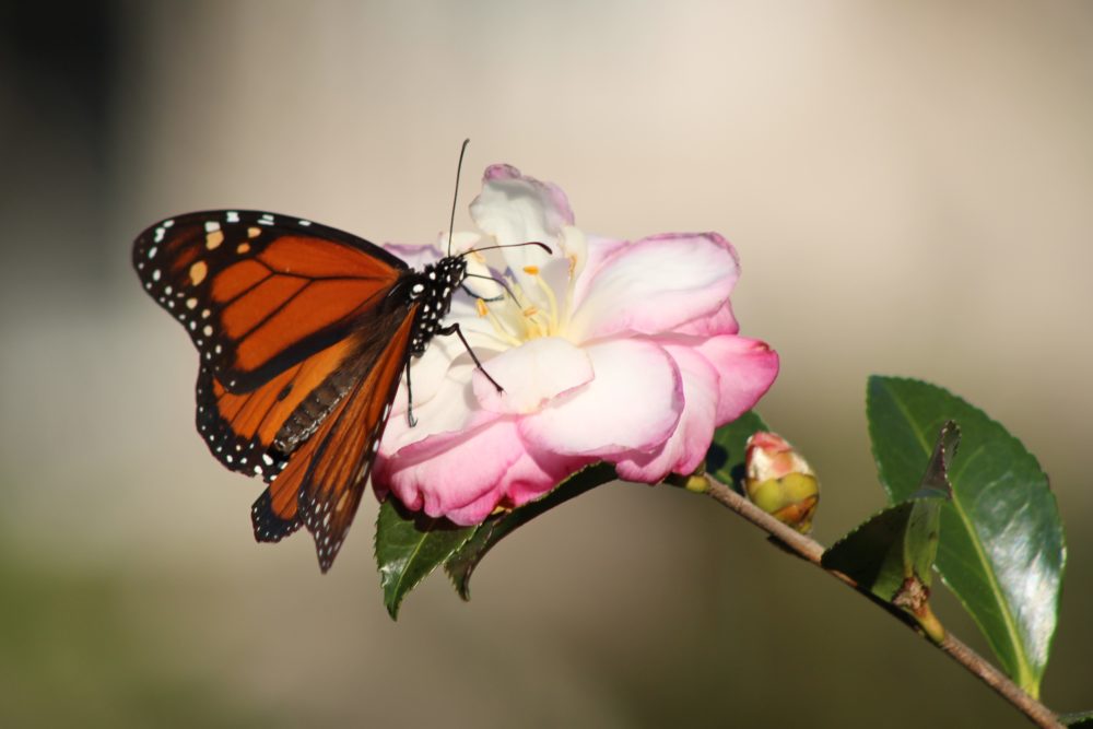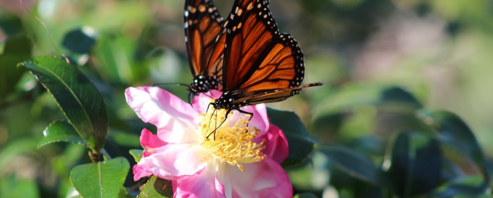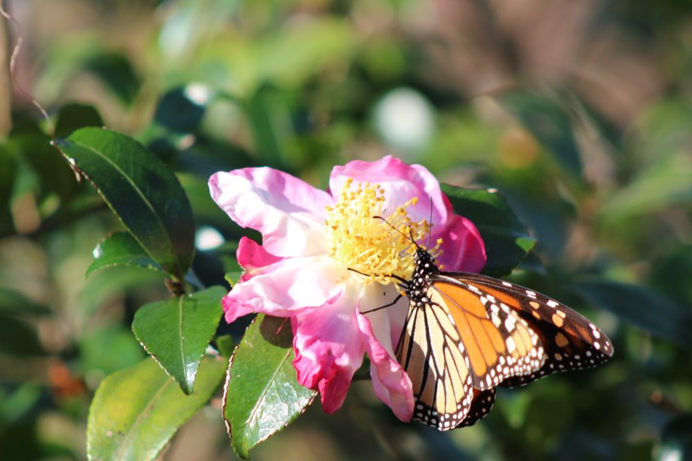 [dropcap]W[/dropcap]ith many of the mature trees in my garden uprooted or broken after Hurricane Michael, I was surprised and amazed with the perseverance of my camellias. I have over 130 different types of camellias, many of them named cultivars. I was thankful that most survived and were not crushed by falling trees. Some of the camellias were windswept and leaning. They had to be straightened. Almost all the surviving plants kept their leaves and buds. By the end of November, there were beautiful camellias flowering in my garden. Even better, these camellias were flowering in time to provide nectar for migrating monarch butterflies. Among all the destruction and with winter approaching, very few other flowers were to be found.