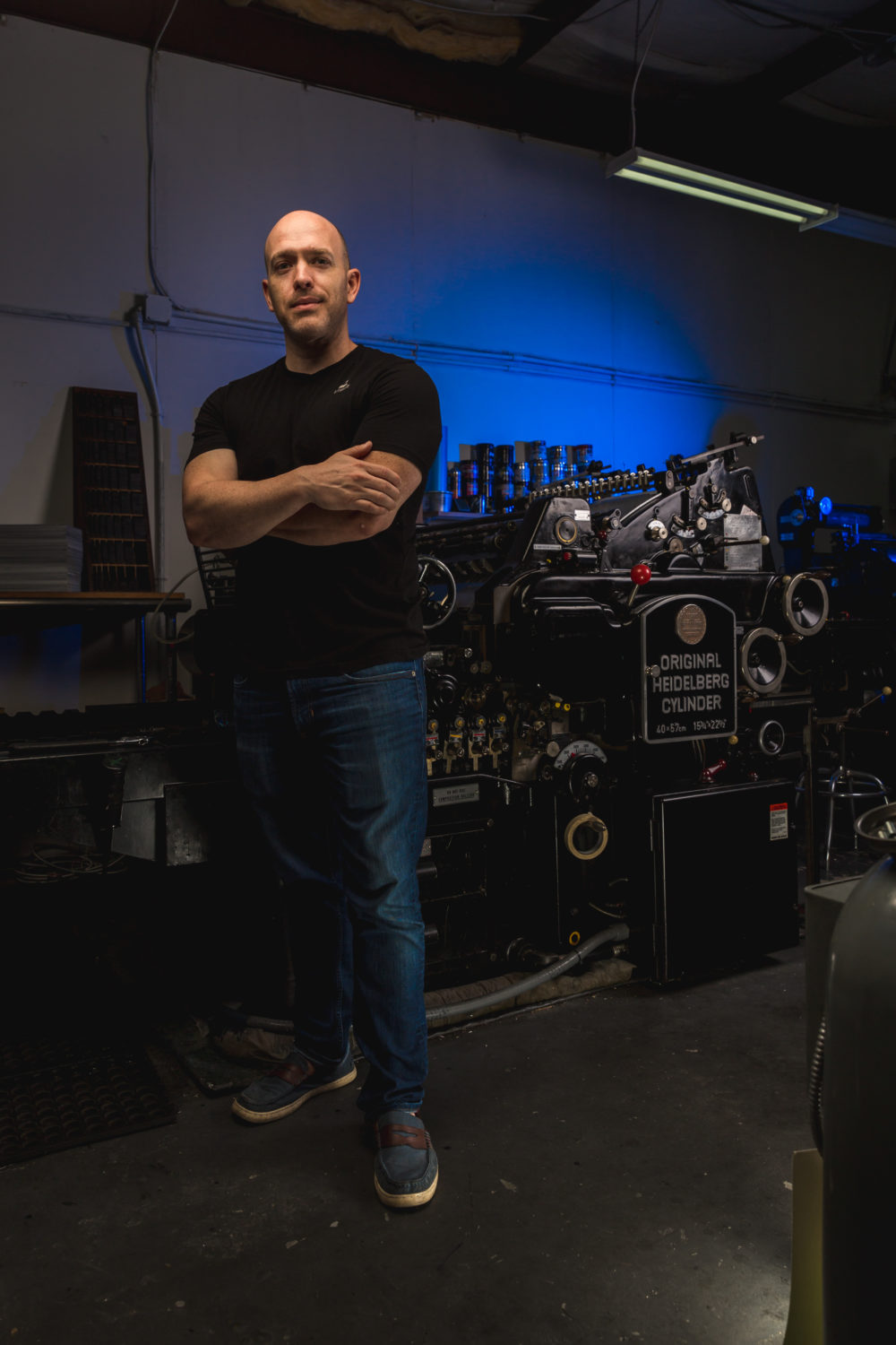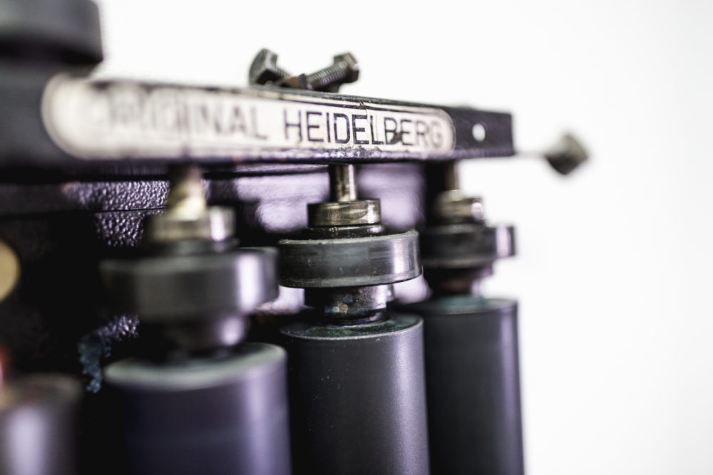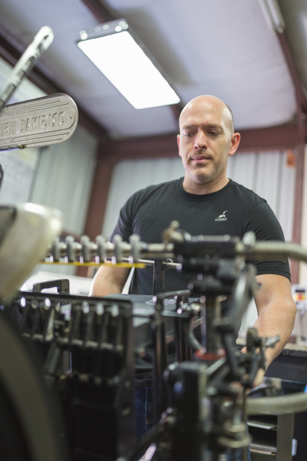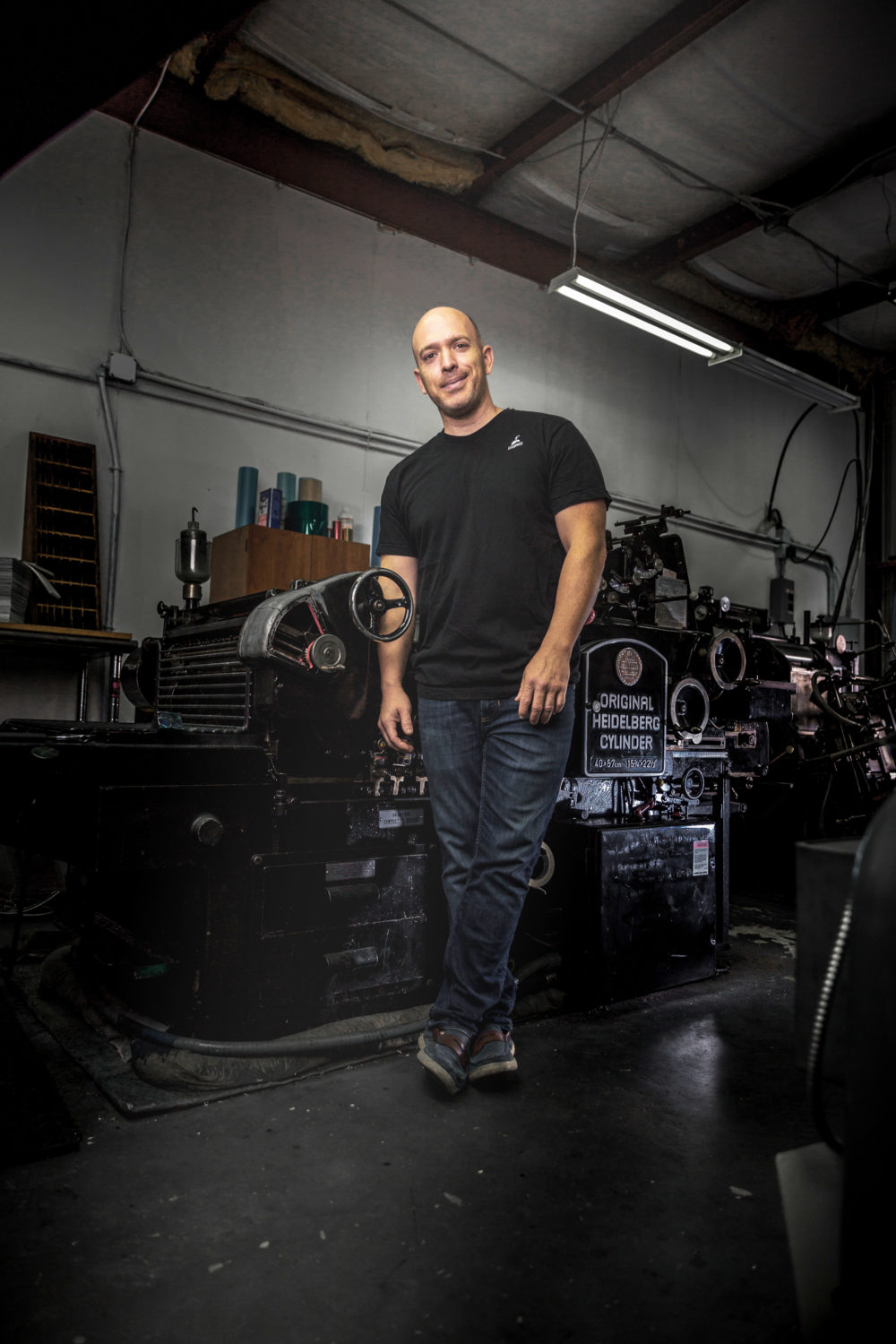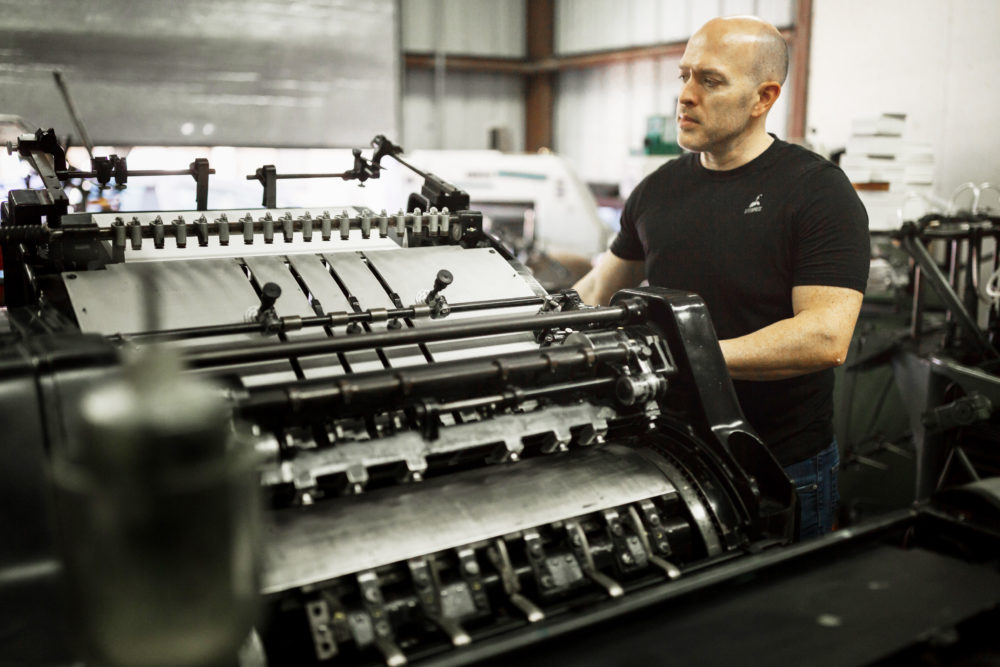 Chris leans back against a turn-of-the-century Heidelberg press with his arms crossed over his chest, the way a hotrod enthusiast might plant himself against a mechanical marvel he’s mastered. This is Tipton’s domain. His crucible. And he knows each piece of intricate machinery, inside and out, like the workings of a finely tuned classic car. “It’s fun to make stuff with your hands,” he says, reinforcing a palpability that can only be truly known in person.