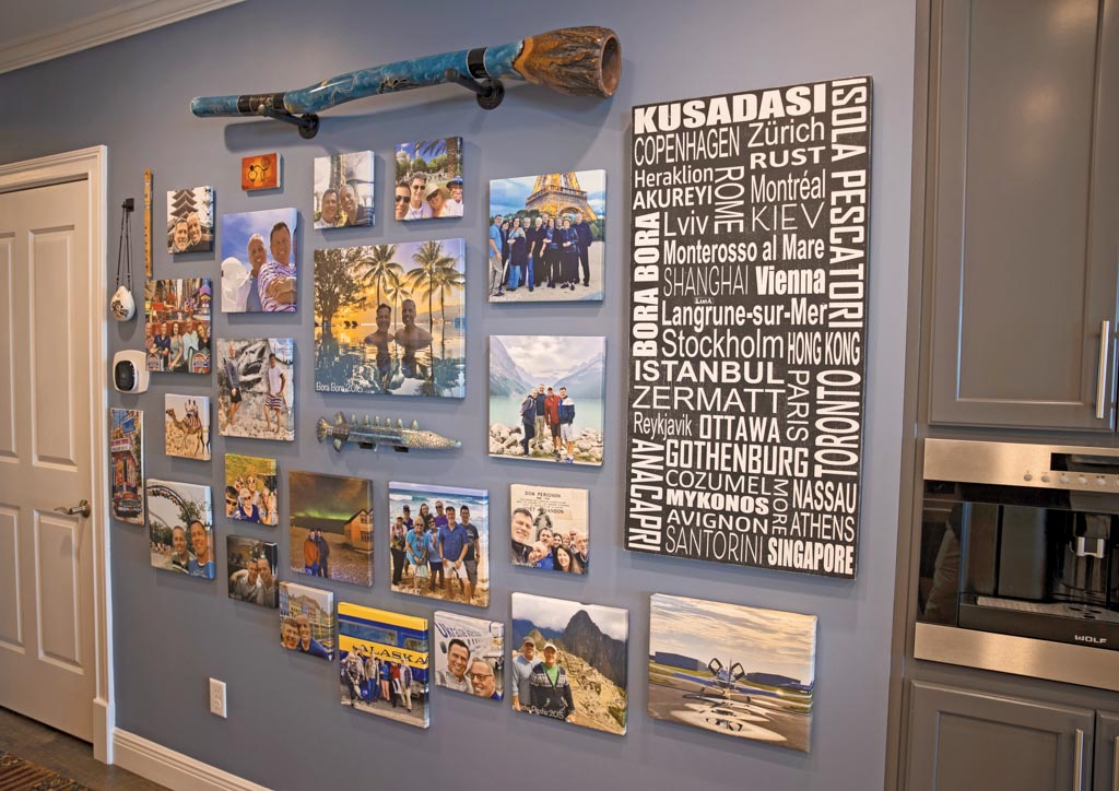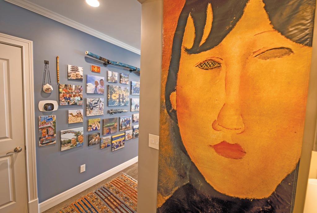 As we get glimpses of Greg and David’s most cherished memories and shared moments, they point out that traveling is their greatest passion. One wall is dedicated to photographs of adventure-filled vacations around the world, along with unique mementos such as a didgeridoo from Australia, a ceramic Chinese “xun,” which is a globular vessel flute, and a handcrafted South African fish.