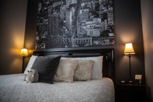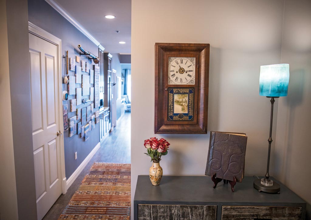 Stepping through the entrance door, visitors are greeted by a stately grandfather clock. “It has been in my family since 1870, when my great-great-grandparents purchased it. It keeps time better than most clocks and chimes every hour, reminding us of our family that has always kept this clock in a special place,” David says, with an appreciative look at the dark, smooth wood. As it has for the past 150 years, the intricate clock chimes—a prelude to memories and captured moments, exemplifying how these condo owners have combined history with contemporary design.