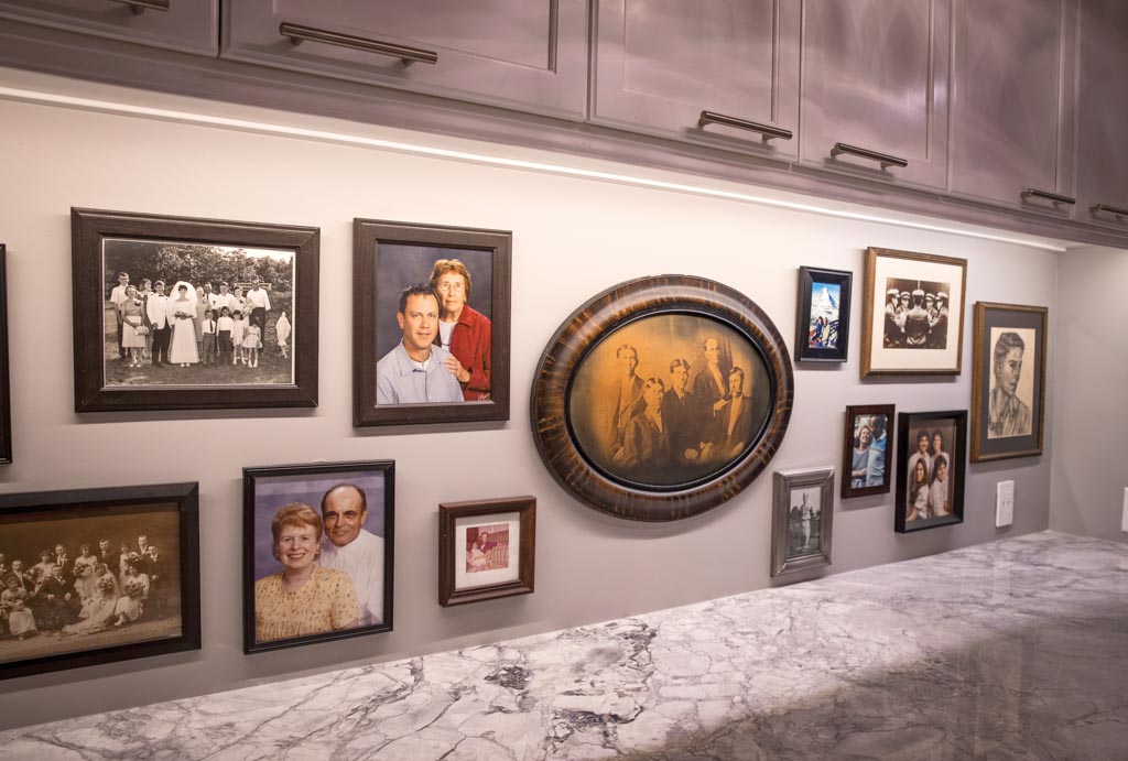 Just down the hallway, of all places, the laundry room showcases the perfect blend of old and new. The small room looks like a miniature art gallery. A modern chandelier gleams where fluorescent bulbs used to be and a floor-to-ceiling Modigliani museum banner hides the breaker box. The washer and dryer are completely concealed with custom cabinetry and a wide marble countertop, above which hang more than a century’s worth of cherished family photographs: a sepia-toned stately portrait of David’s ancestors from the late 1800s; a faded image of Greg’s great-grandparents’ 1916 wedding; a decades-old Polaroid of David’s parents against an alpine backdrop; a candid shot of him with his father as a child; and a formal photo commemorating Greg’s parents’ 25th anniversary, just to name a few. “We’ve really enjoyed incorporating family memories throughout our home,” says Greg.