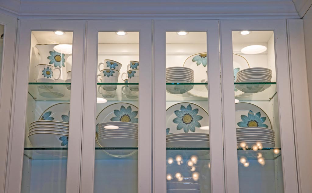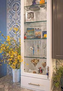 David adds that one item in the kitchen made its mark on the entire condo, with family memories again coming into play. “Our color scheme for the condo was inspired by the ‘Up-Sa Daisy’ design pattern of my parents’ Noritake china set. It has been in our family since their 25th wedding anniversary in 1967. These dishes were part of our day-to-day life and meals. When my mother passed away in 2009, the china received a special place in our glass-front kitchen cabinets.”