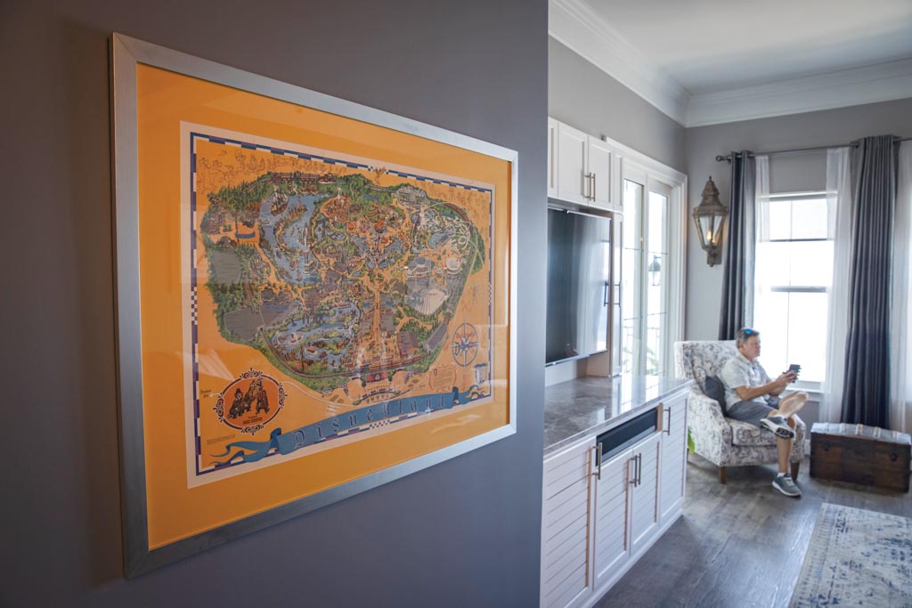 Another heirloom holds a special meaning for David. At first glance, it appears to be a picture or painting, but a closer look reveals an original map of Disneyland from the year 1955. “My father visited the California park when it first opened and he purchased this large map. Me being a huge Disney fan, I remember how it amazed me as a child. For years, I would carefully unfold it and ask my father questions. I have so many special memories of it, so I had it custom framed. Now our guests enjoy seeing the park in its early days.” Likewise, in the curio cabinet in the adjoining living room, the glass shelves are crowded with Hummel figurines from David’s parents and tchotchkes from Greg’s grandparents. “Happy family memories everywhere you turn,” Greg says with a smile.