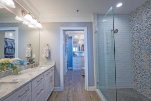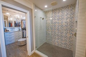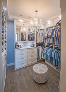 The most extensive project post-Hurricane Michael was the remodeling of the master bathroom, where they opted to replace the garden tub with a large walk-in shower, allowing for the size of the master closet to be doubled. “We hired California Closets to design it,” David says, and reiterates that the outcome and added functionality turned out perfect.