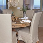 Bright white pillows with navy blue accents mix well with the neutral tones of the furnishings. Many natural elements are used such as a solid wood slat dining table and large glass jars filled with sea biscuits, sea urchins, and seashells collected from local waters by the Cantrell daughters and grandchildren. It brings the outside in and inserts a piece of family to complement the magnificent views from the family room and master bedroom.
