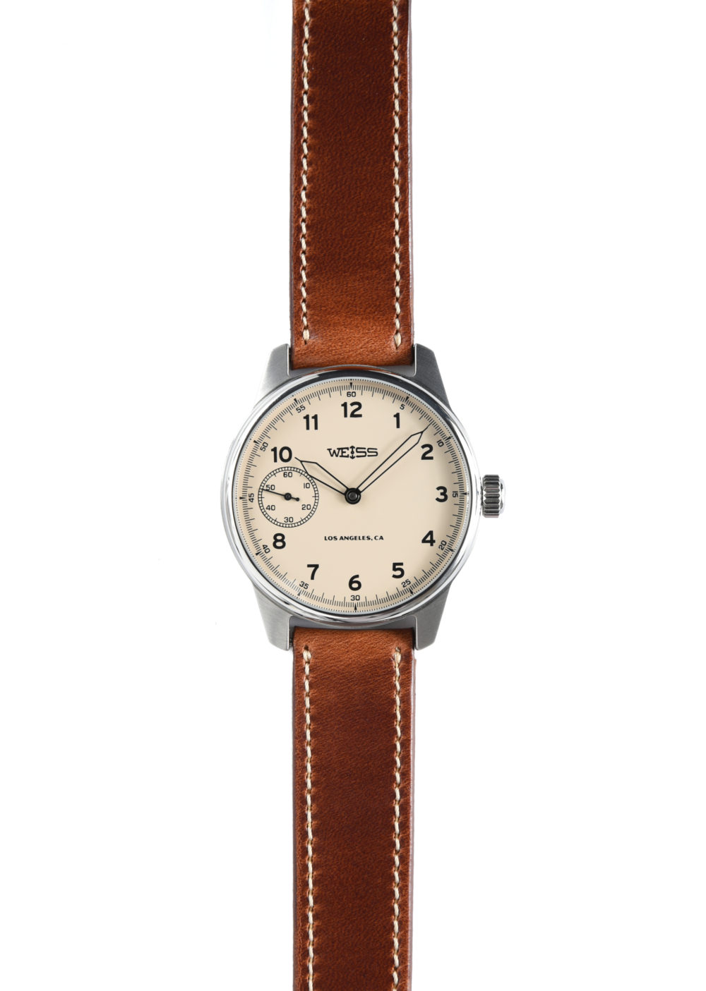 The American Issue Field Watch–Latte Dial is a limited production timepiece built by hand. The timepiece and movement are individually numbered, and delivered in a custom-built California pine wood box, also built by hand in the USA.