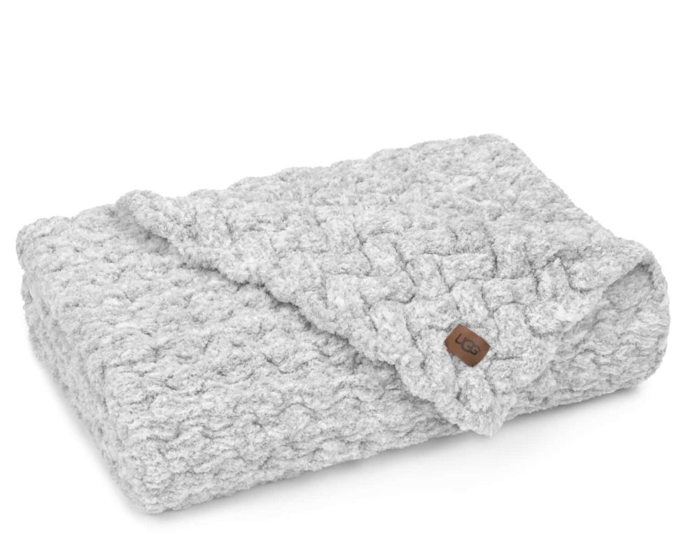 A tactile crisscrossed pattern lends extra coziness to a chunky, hand-knit throw blanket manufactured with soft, fleecy yarns. Bede Throw Blanket by UGG®