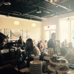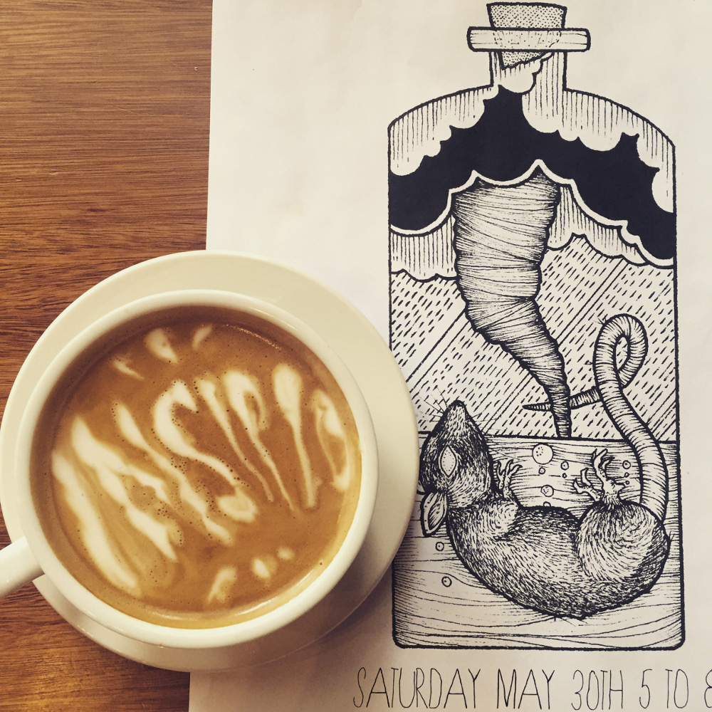 The Blue Ribbon Healers played at the show opening in May and guests were invited to try Amavida’s newest coffee creation in its experimental phase, the nitro cold brew coffee tap. The nitro cold brew is a new way of charging iced coffee with nitrogen gas. Jordan Kady tells us, “Nitrogen gives the coffee a great new flavor and is something Amavida Coffee is experimenting with.This was the first night that we rolled out the nitrogen tap. It was a long-time goal of Amavida’s owner, Dan Bailey, to try it out and he brought the idea to Phill Mercer who designed and built the prototype system.”