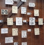 The exhibit showed pen-and-ink drawings and one hand-cut lino print, a process in which the artist carves into a block of linoleum to produce a design, rolls it with ink, and prints it onto paper.