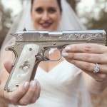 Lisa, a country girl at heart, donned silver cowgirl boots underneath her wedding gown. A favorite wedding gift from Joel is the decorative stainless 1911 pistol with ornate engravings on the slide including a deer and the words “Lisa and Joel, December 6, 2014.” The family spends much time together in the woods during deer hunting season and their love for the sport became a theme in their wedding décor.