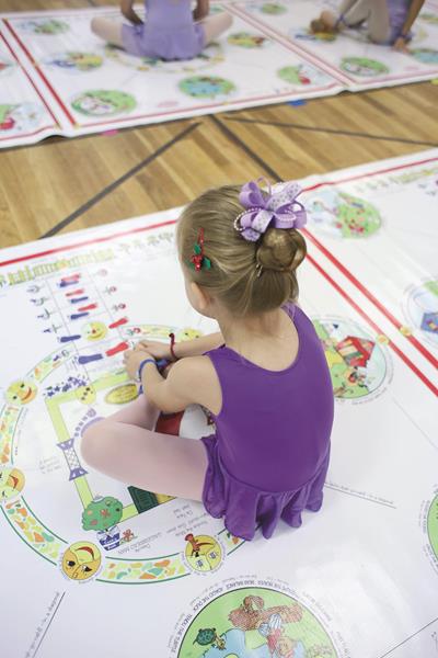 The “house” the students must not leave unless directed is at the center of each Alphamat, designed to teach the fundamental directions on a stage. The colorful, vinyl mats are also integral to the MKOD method of teaching dance, which Bense began using 37 years ago when she opened her first dance studio in Panama City. All the credit for the innovative and creative development of MKOD goes to her mother, the late Mary Alpha Johnson, who was a professional dancer and dance teacher for 67 years.
