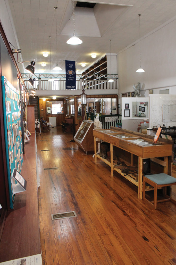 The flooring is likely the most beautiful part of this vintage building. Made of heart pine, some of the boards are over 18 ½ feet in length, and were laid using the tongue-and-groove method. They were left unfinished, and were oiled occasionally to preserve the wood. Over the years, oil and dirt buildup caused them to darken considerably, but this did not diminish the beauty of the craftsmanship. Sometime between 2002 and 2005, all the flooring was sanded to its original light-colored finish before being sealed with a clear satin polyurethane varnish – a perfect setting for a new history museum. Read about the new exhibits on the next pages.