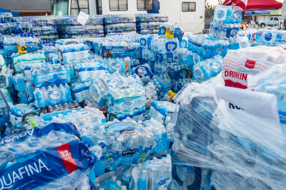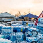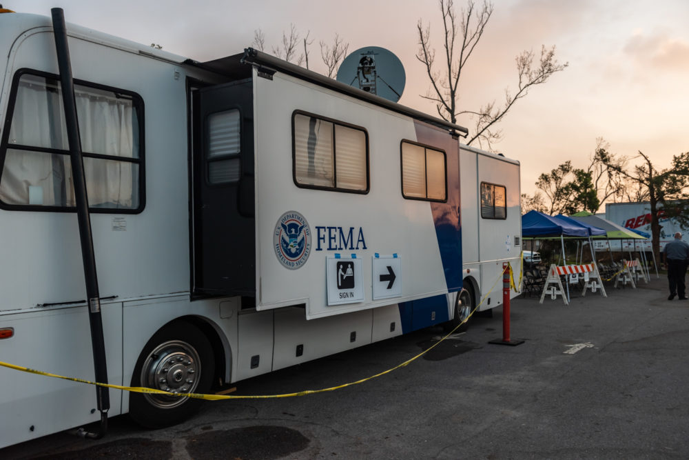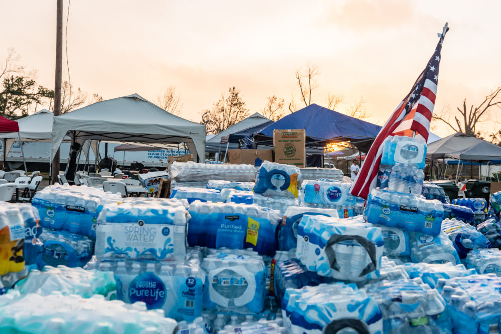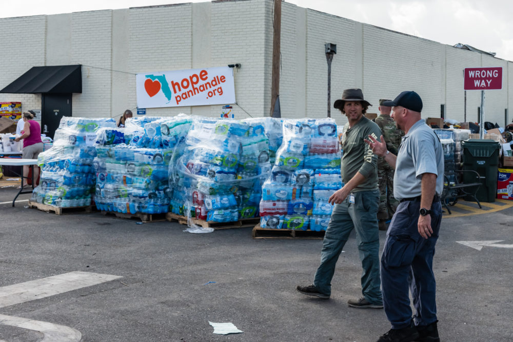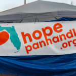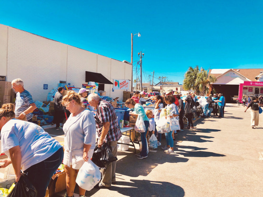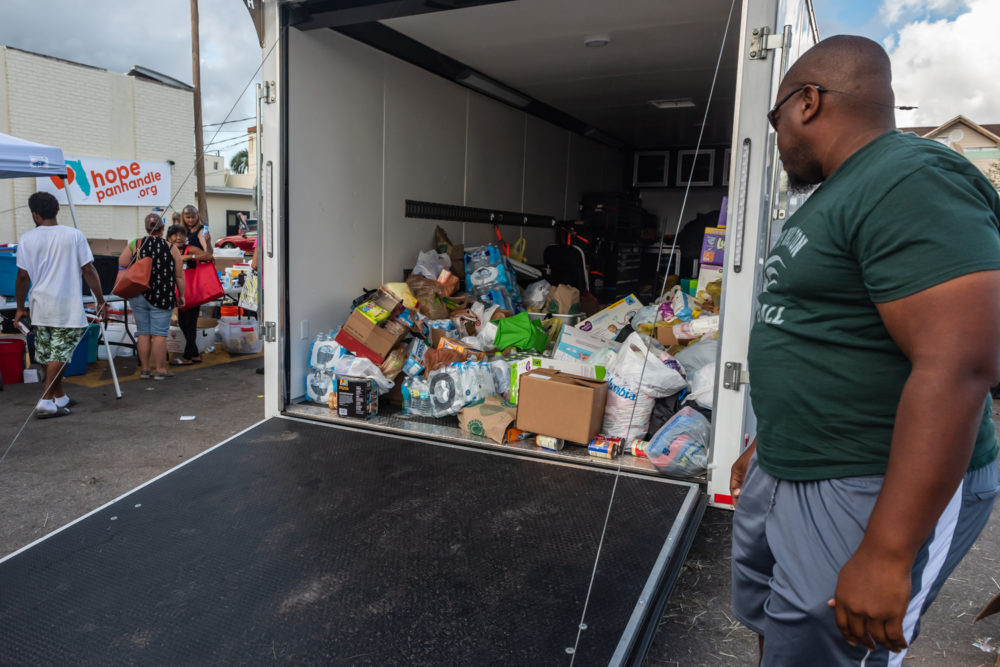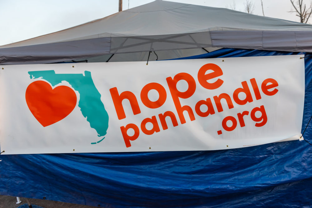 What once was the center of town has transformed into a hub for supplies and food. It looks much like a refugee camp. A large temporary banner reads “HopePanhandle.org.”