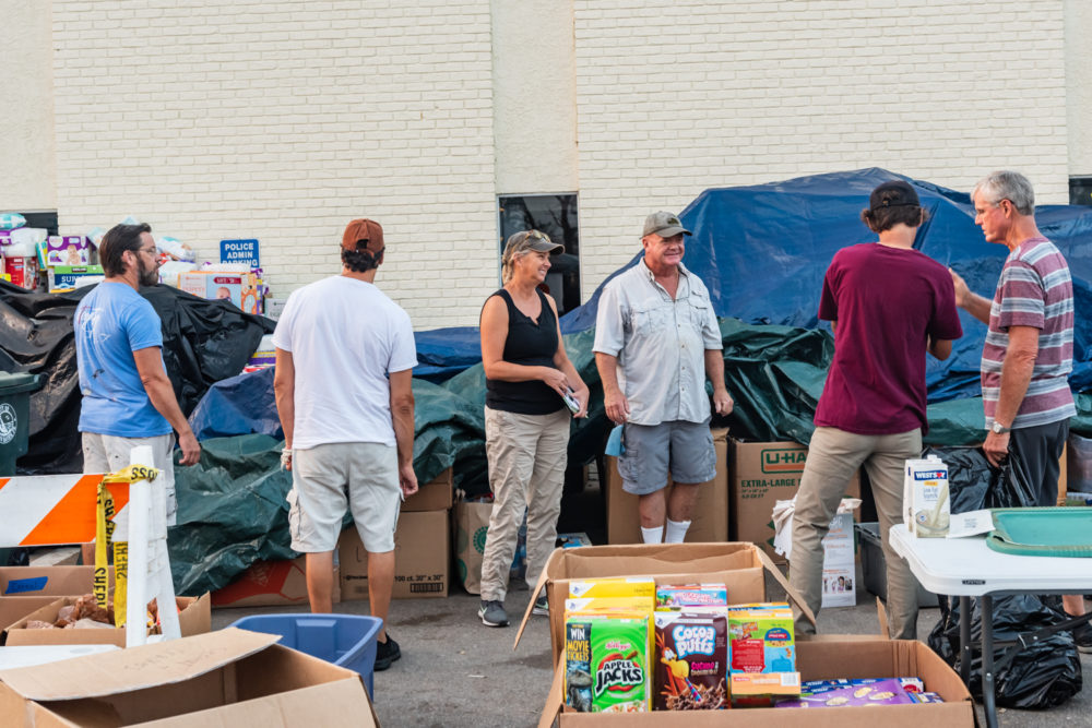 Sunburned, sweaty, and resolute, Reese Harrison helps unload supplies with a group of people. A few hundred feet away, his wife Mara answers questions, listens, points to boxes of supplies. The couple has been driving from Walton County every day to help the Lynn Haven community.