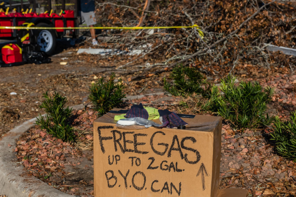Lifting the victims’ spirits became a mission of its own. “On Sunday, we played all Christian music and people were still very broken that day,” Mara says. “But now, see? It’s fine. It feels happy. They know they are neighbors. It turned into a good thing in the midst of something horrible. We are passing out gas to people who are running on generators, you know, to keep their food cold. But we have to ration it to two gallons per person. Many would like to get five gallons because then they would feel comfortable driving somewhere. But we have to ration it and nobody complains. And they always say ‘thank you.’ They are gracious. We are potentially going to have more gas to distribute today. We have realized in this thing, when you have a grassroots effort, the situation can be amended immediately and you don’t have to wait to go find the right agency to help you.”